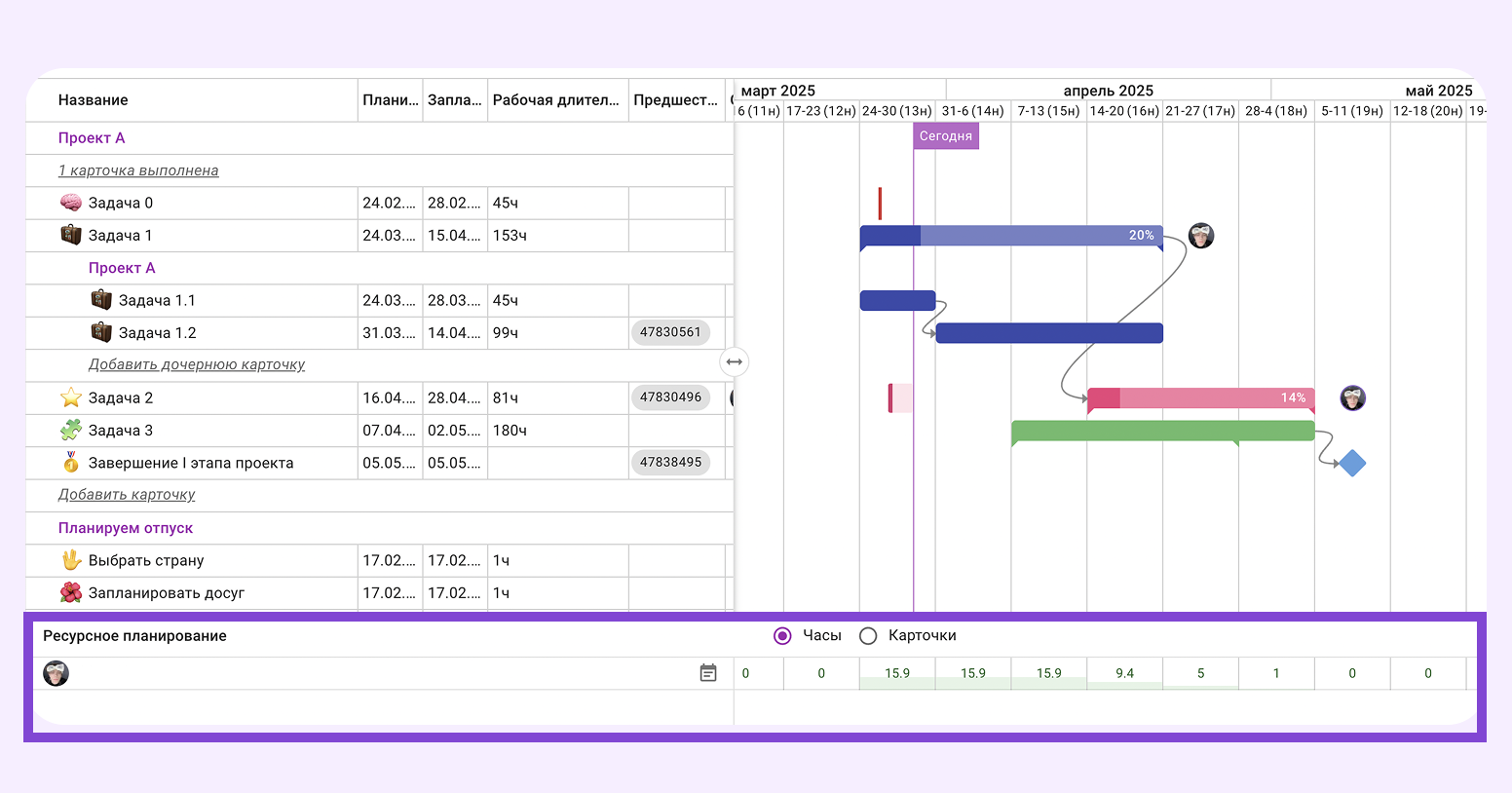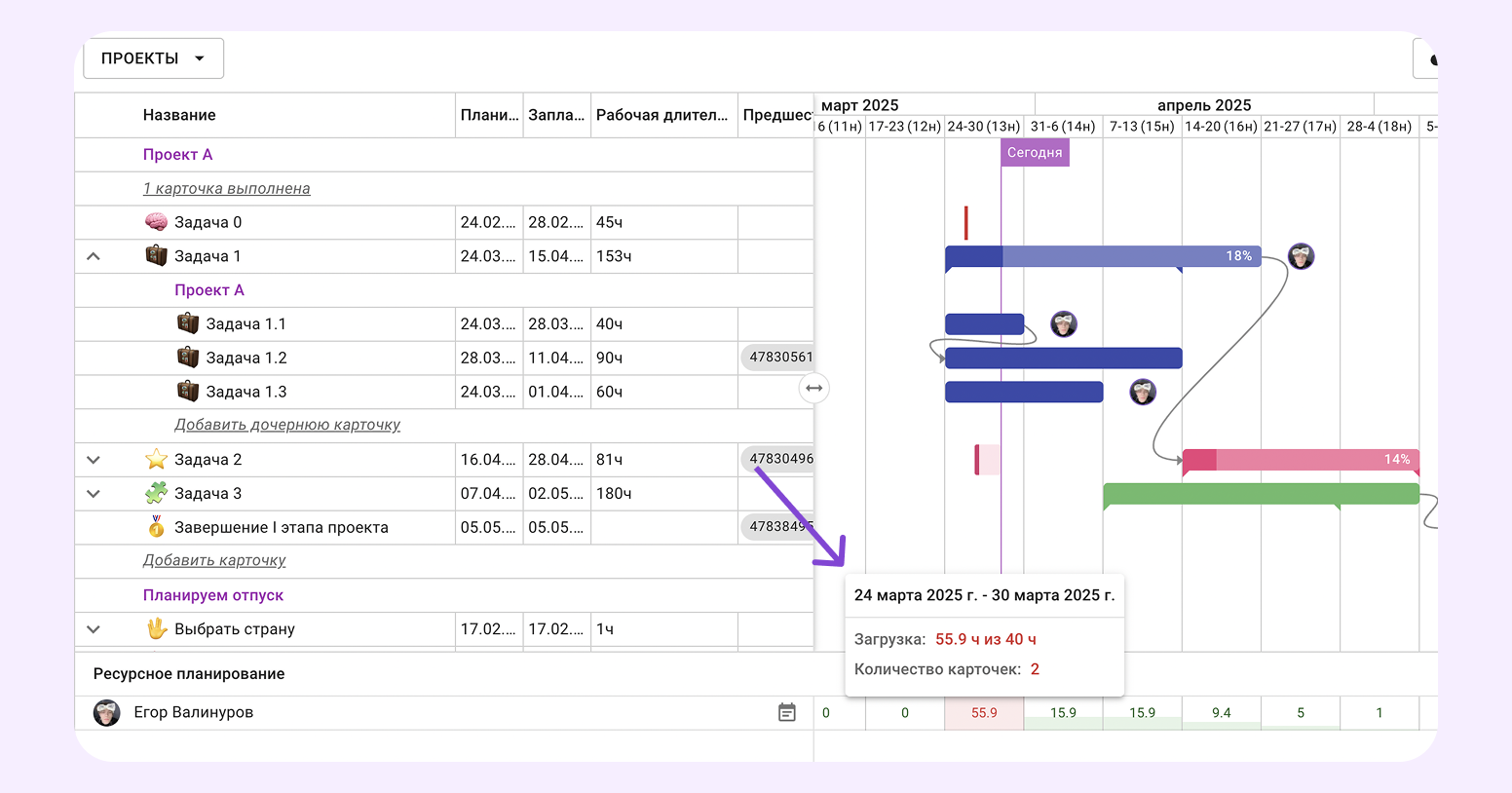 Руководитель определяет, сколько часов команда может заниматься проектом. Затем вносит в диаграмму Ганта задачи, указывает ответственных и сроки выполнения. Система подсвечивает перегруженных сотрудников и указывает периоды, когда нагрузка превышает норму.