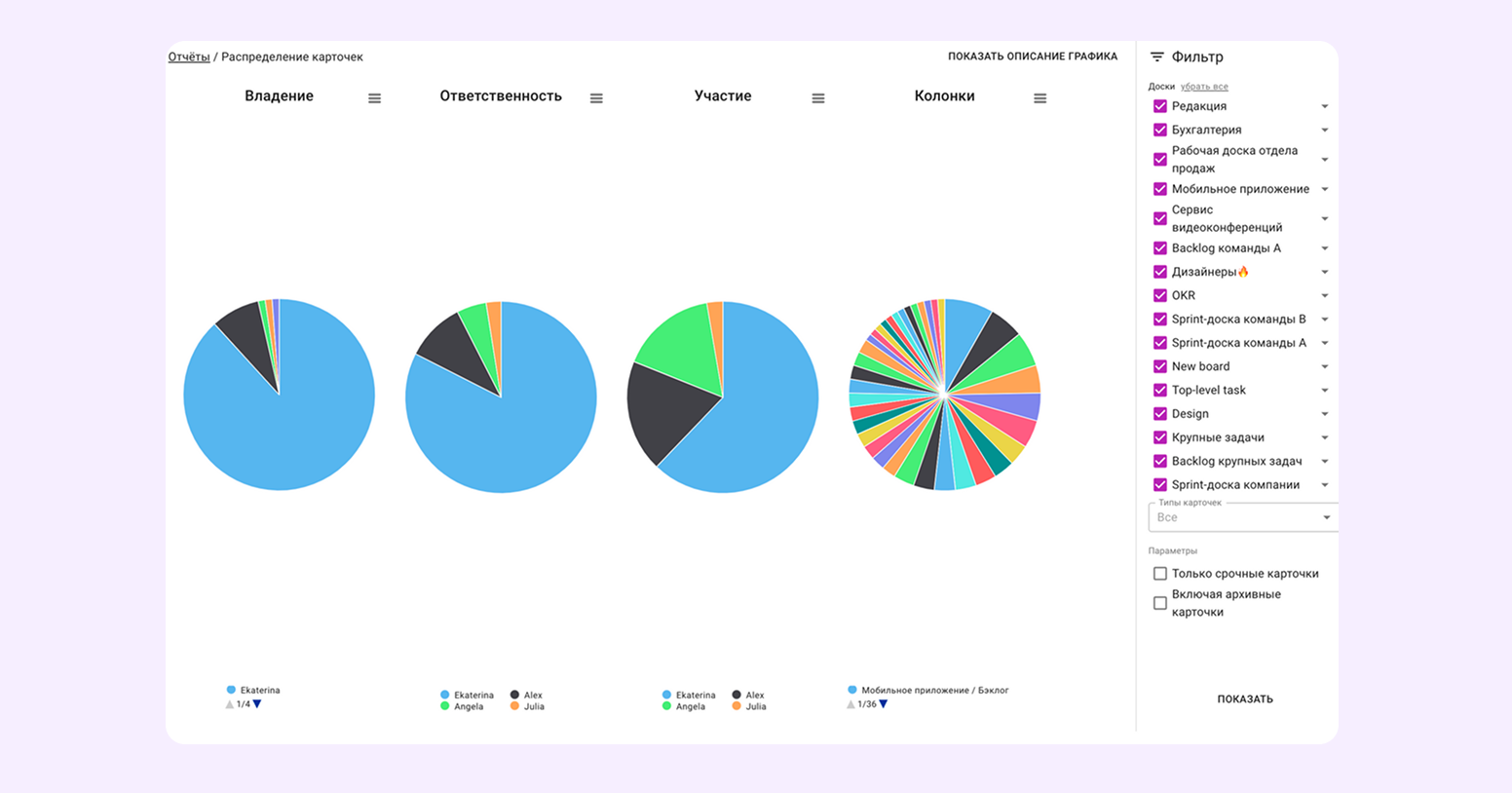 В отчете можно отследить, как распределены карточки по ответственным и колонкам — увидеть, кто занимается их выполнением и на какой стадии большинство задач. Также можно отсортировать и увидеть только карточки, например: