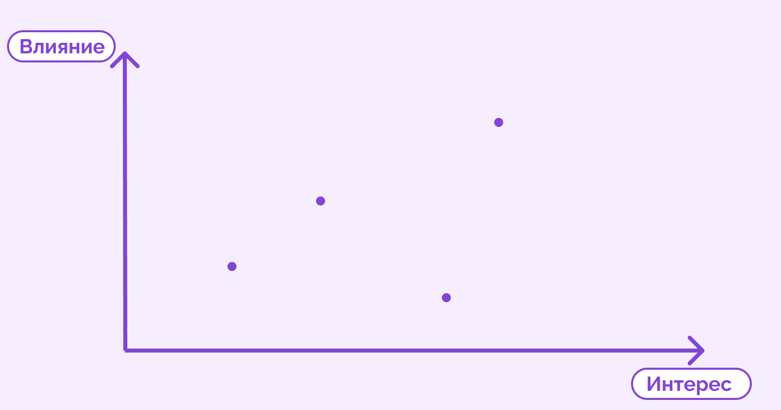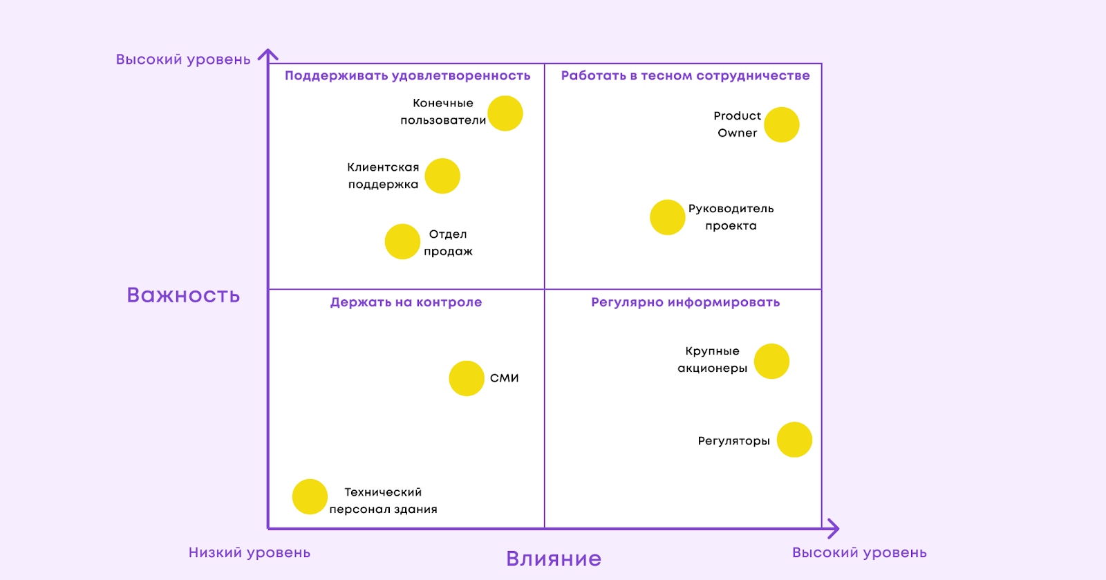 Разместите всех стейкхолдеров внутри этих осей. Это поможет понять, с кем нужно тесно сотрудничать, кого информировать, а кого просто держать в курсе ситуации.