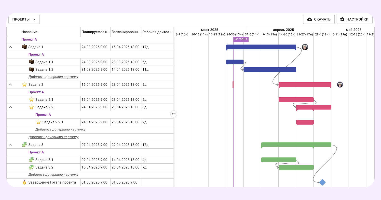Диаграмма Ганта — это таблица, в которой отображается последовательность и сроки задач. В продвинутых инструментах управления проектам она также может содержать ответственных, ссылки на карточки со всей информацией о задачах, связи между дочерними и родительскими карточками.