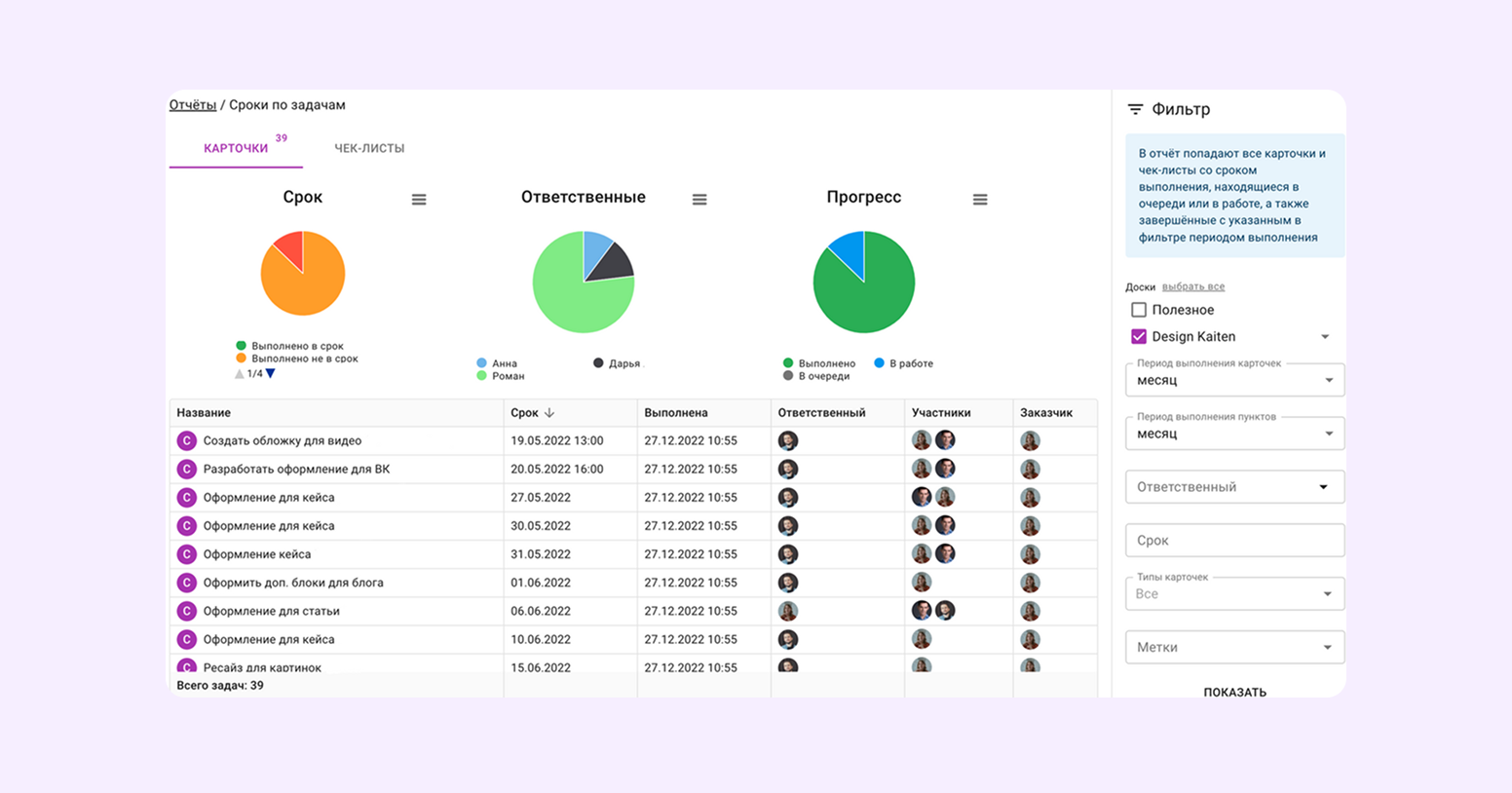 В Kaiten есть 3 диаграммы с кликабельными сегментами и сводная таблица по соблюдению сроков выполнения задач.
