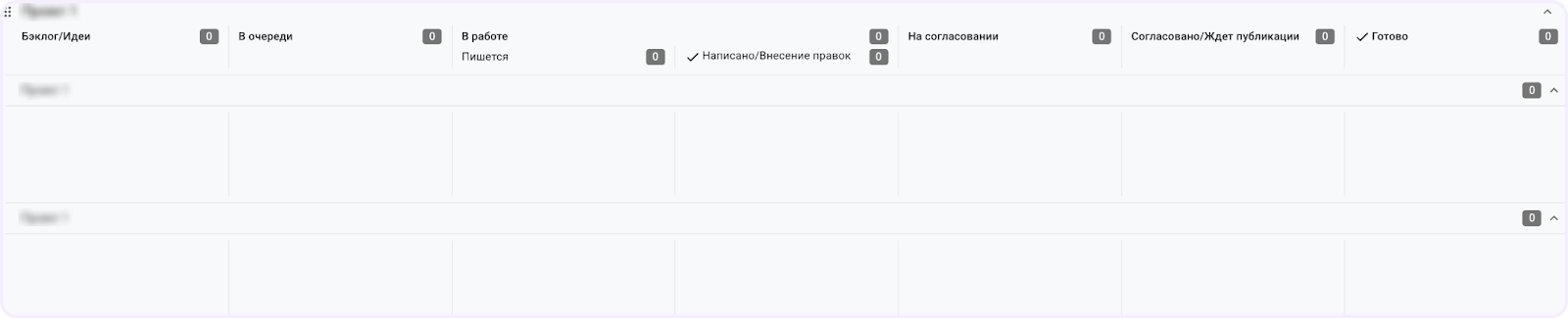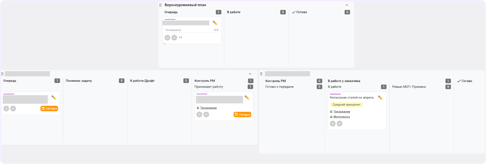 Пространство конкретного проекта. В таких пространствах сотрудники добавляют доску, которая нужна для взаимодействия между нашим агентством и заказчиком. У нее нет фиксированного количество этапов, потому что все колонки настраивают под конкретный проект. Например, добавляют новые этапы, если в проекте участвуют копирайтеры или разработчики со стороны заказчика.