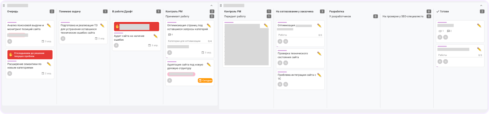 За прошедший год SEO-подразделение полностью перешло на управление проектами через Кайтен. Теперь на еженедельных созвонах руководитель за пару минут изучает доску, фиксирует проблемные участки и корректирует ситуацию до того, как возникнут угрозы сорвать дедлайн и снизить качество обслуживания.