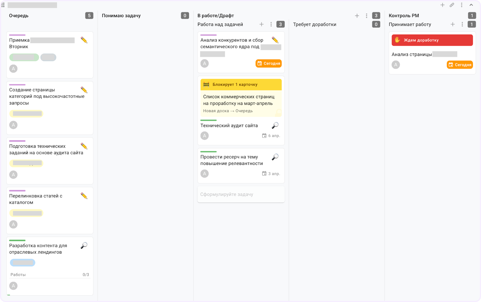 Личное пространство SEO-специалиста. Там находится собственная канбан-доска сотрудника, куда попадают задачи со всех его проектов. Доска позволяет получить целостную картину о реальной занятости, помогает расставлять приоритеты и видеть узкие места без привязки к конкретному клиенту.