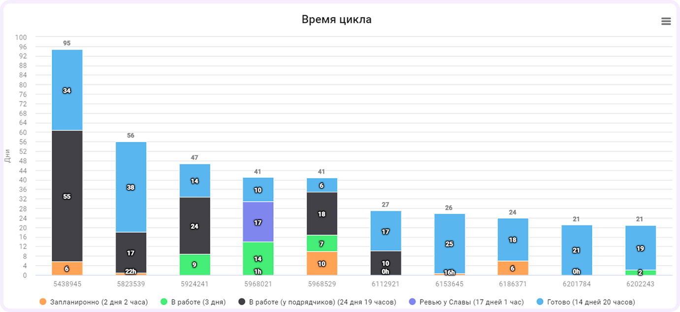 В Кайтен есть встроенные графики и отчеты, которые помогают оценивать эффективность продаж. Например, можно отслеживать: