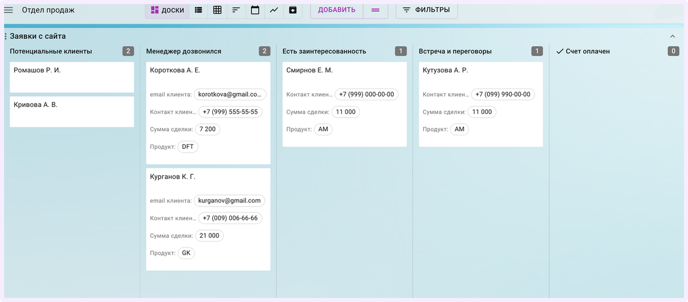 Каждая карточка — отдельный клиент или сделка. Перемещая карточки между колонками, менеджеры показывают текущий статус работы. Так вся команда видит, что происходит с продажами в моменте.