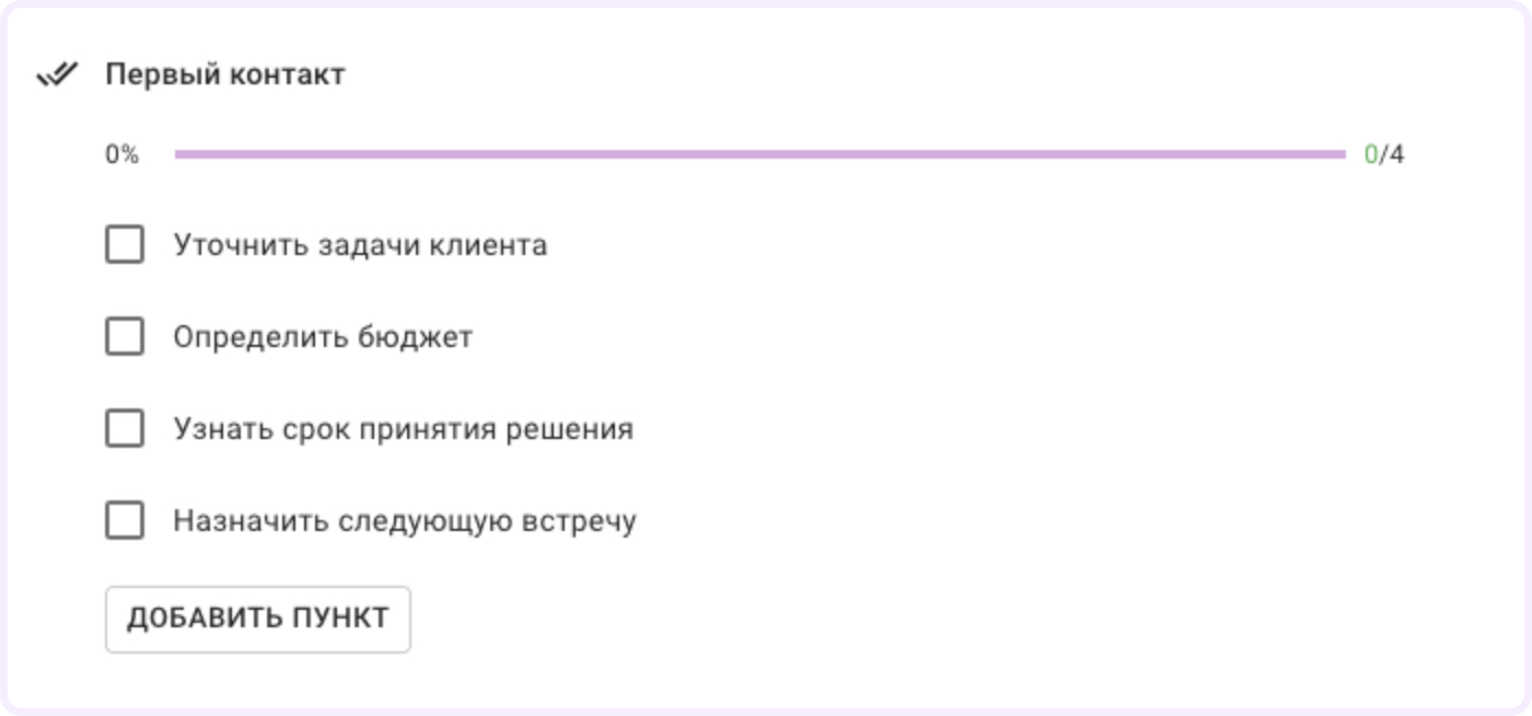 Чтобы менеджеры не пропускали важные шаги, используйте чек-листы внутри карточек. Например, для этапа «первый контакт»: