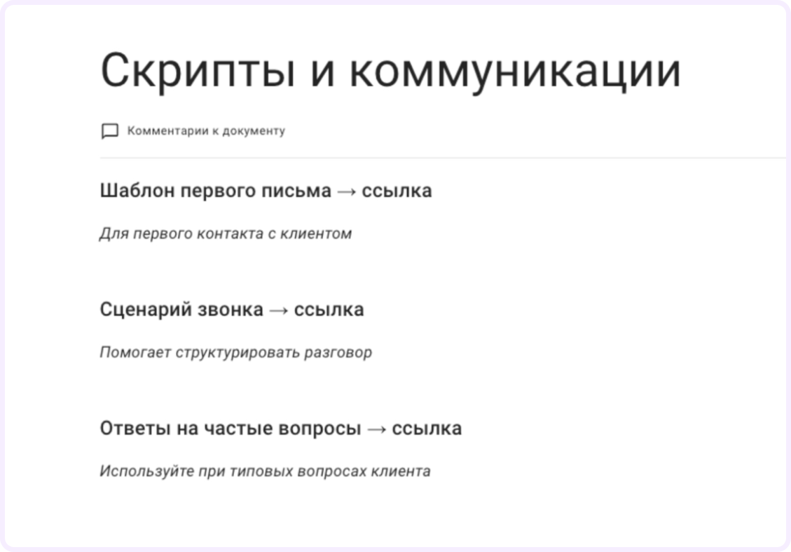 Этот раздел экономит время: менеджеру не нужно искать ссылки или спрашивать коллег — все собрано в одном месте.