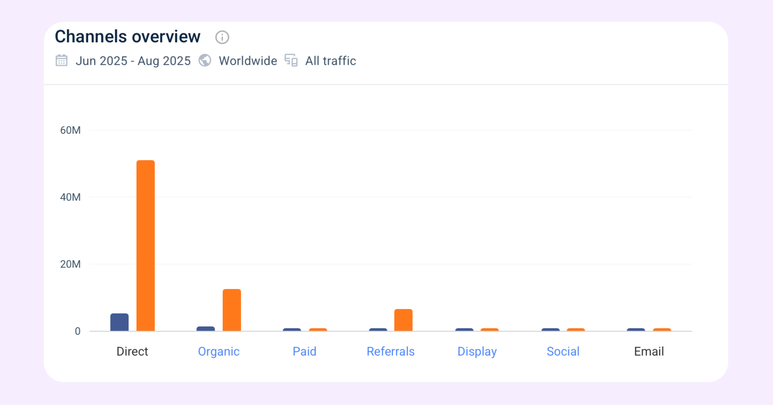 - Используйте инструменты вроде SimilarWeb, SEMrush, чтобы оценить трафик, источники, ключевые слова (например, сколько органики/платного трафика получает конкурент).