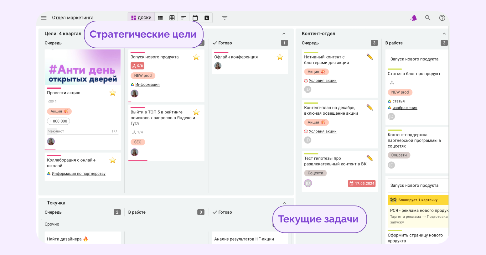 - Системы управления задачами. Kanban-доски показывают, какие стратегические ставки реализуются, кто за что отвечает и какой результат достигнут. Например, в Kaiten можно к задачам привязывать родительские карточки с целями, чтобы большая цель была всегда на виду. А также можно расположить несколько досок на одном пространстве, чтобы вся команда видела общие цели компании и текущий прогресс.