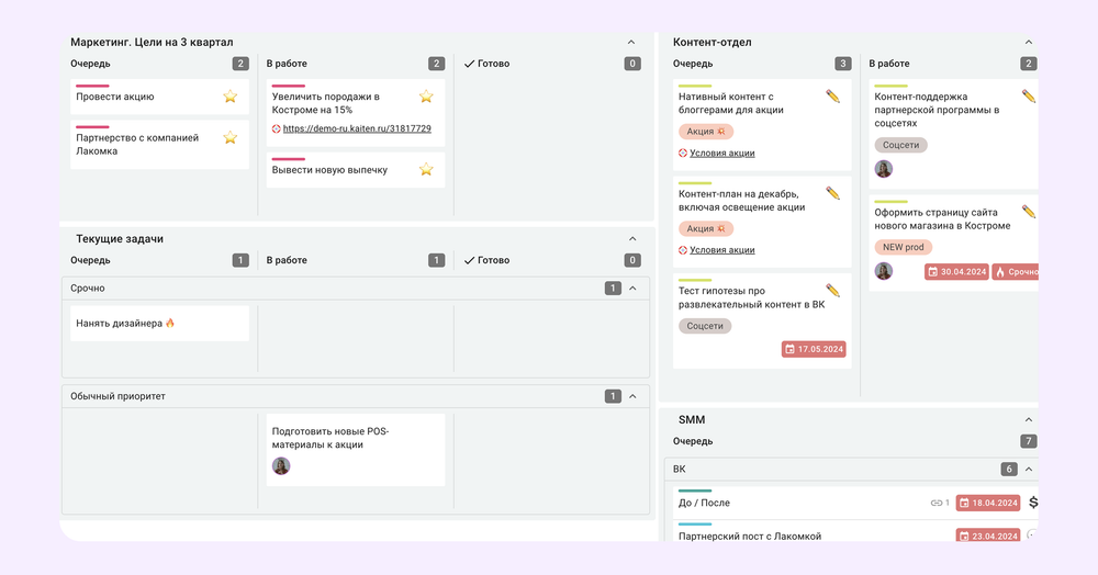 Один из таких сервисов — Kaiten. Здесь можно разместить все идеи по развитию продукта в бэклоге в виде отдельных карточек. Команда видит, какие фичи в планах, а над какими — стоит работать прямо сейчас. У каждой задачи можно расставить сроки и ответственных, прикрепить медиа и запись созвона.