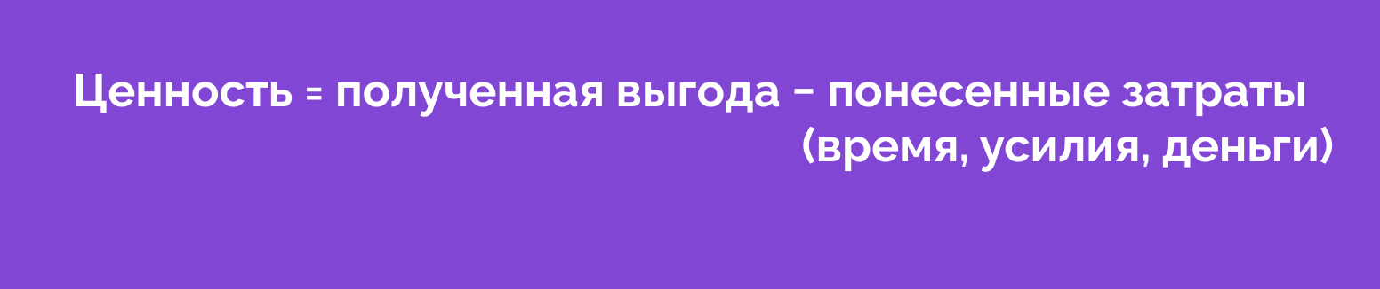 Ценность — это измеримый результат или выгода для клиента в его контексте (решенная задача, сэкономленное время, сниженные риски, рост дохода/статуса), которую пользователь получает при решении своей проблемы с помощью вашего продукта. Эта выгода всегда выше, чем затраченные усилия, время или деньги.