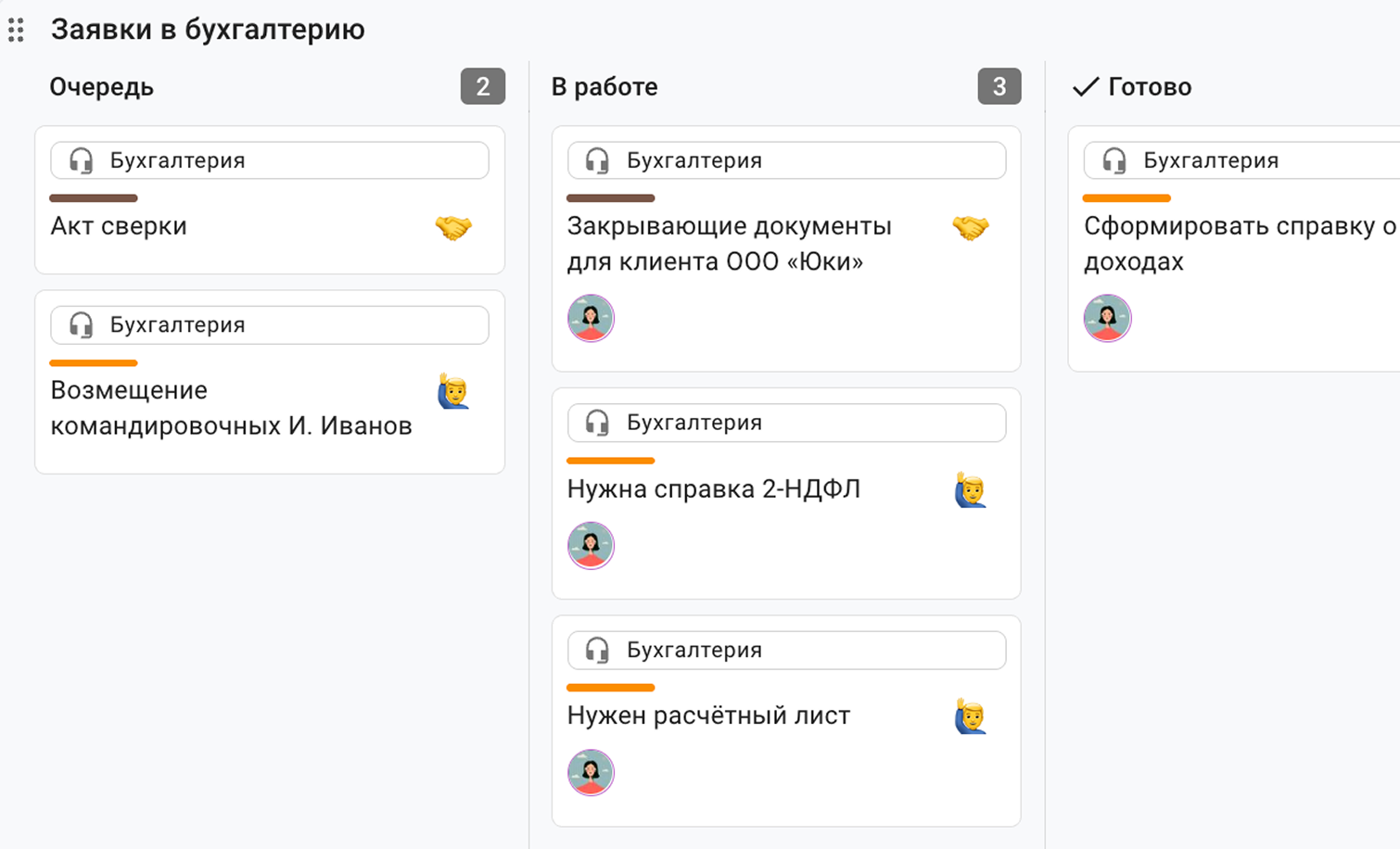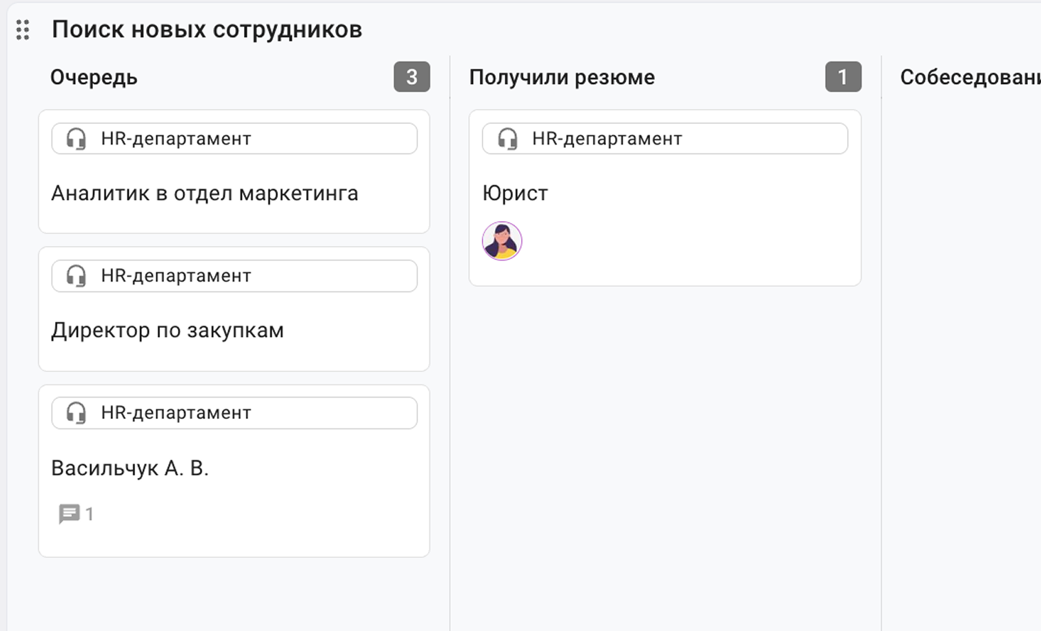 Отпуск, справки, оформление новичков — всё через один портал. Сотрудник оставляет заявку — HR видит карточку на доске, обрабатывает и передает в нужный отдел