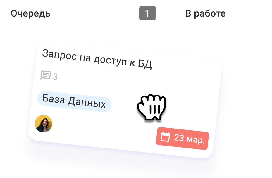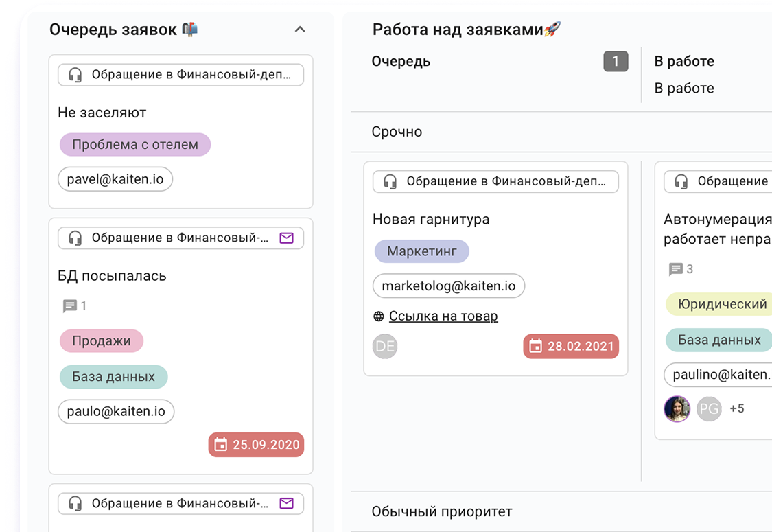 Заявка попадает на канбан‑доску как обычная карточка. Назначайте ответственных, ставьте приоритеты, общайтесь с заказчиком прямо в карточке. Передавайте задачи между отделами без потери контекста