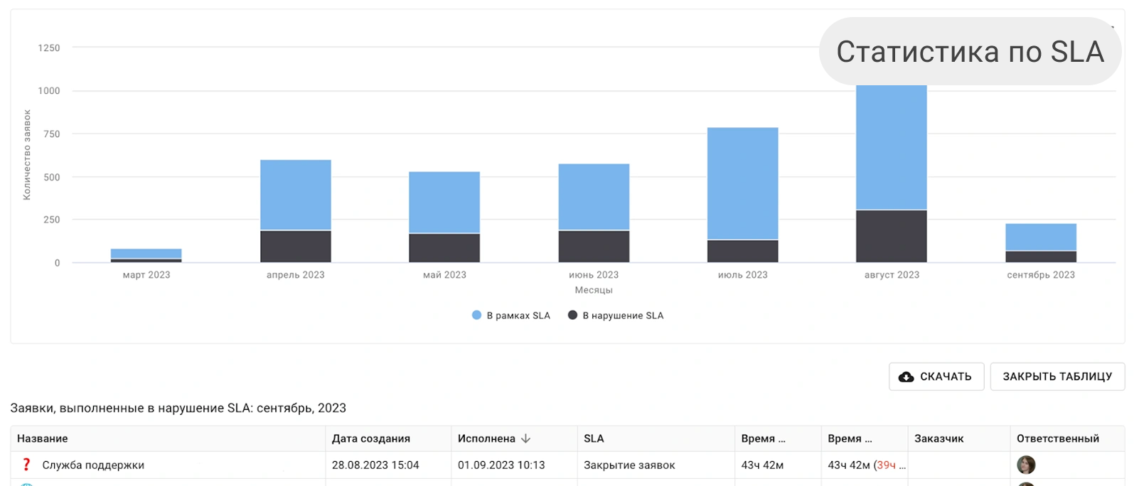 Отчет по соблюдению SLA покажет количество заявок, обработанных в рамках допустимого времени реакции